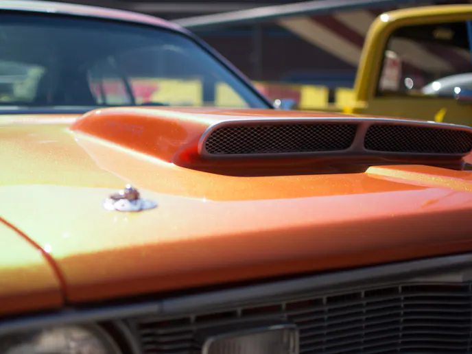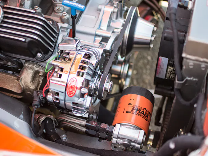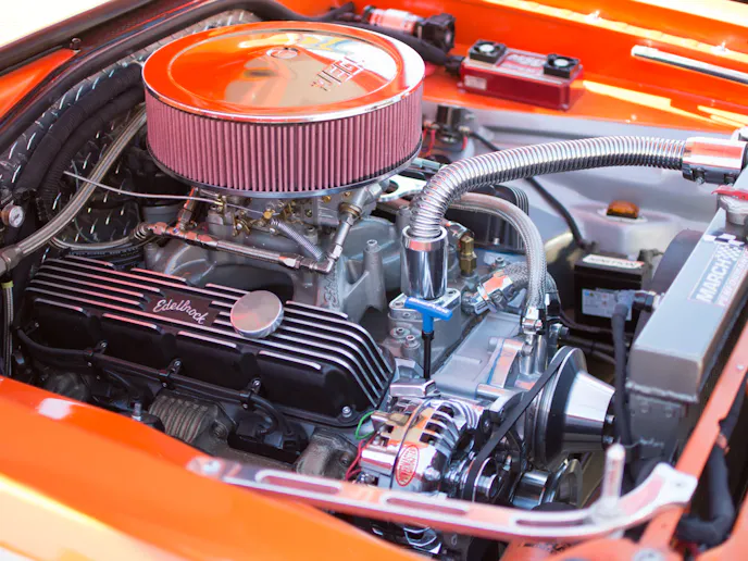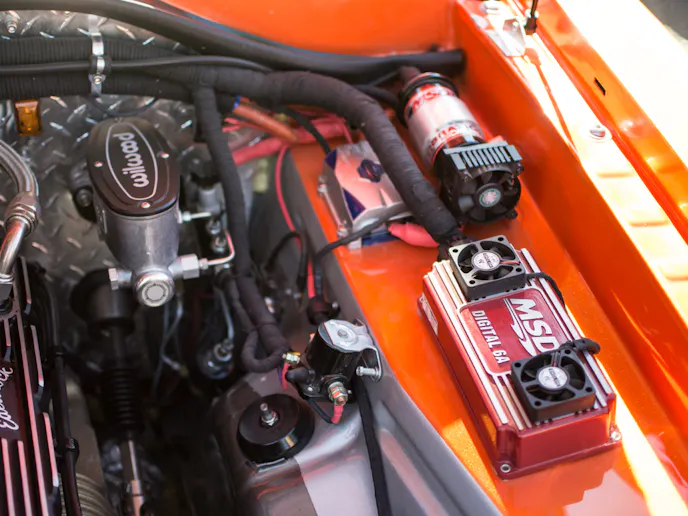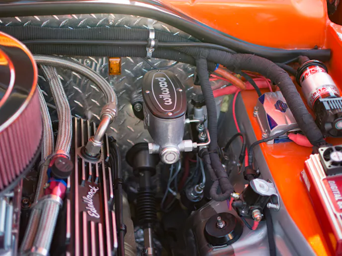 Along with the stunning orange pearl paint, Darryl also used a flame and heat resistant nano-paint under the hood to help keep the rest of the paint safe from any heat — that’s the gray color in the engine compartment. He also added Wilwood disc brakes all around and mounted Centerline die-cut wheels with Mickey Thompson Sportsman tires under the car. New cars are great, but you can’t beat the feel of a classic musclecar with some pony power.