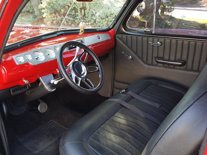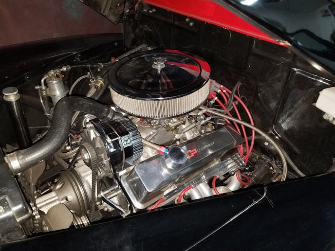 Later, he saw the car with the red on it that you see now. The bumpers and trim were still black, but it was better. That is what it looked like when Dave bought it, and as he has been driving it, he has had the bumpers and grill re-chromed. “I drive the crap out of it,” Dave told us. It’s built with a small-block Chevy 350 cubic-inch engine and an automatic transmission with overdrive.