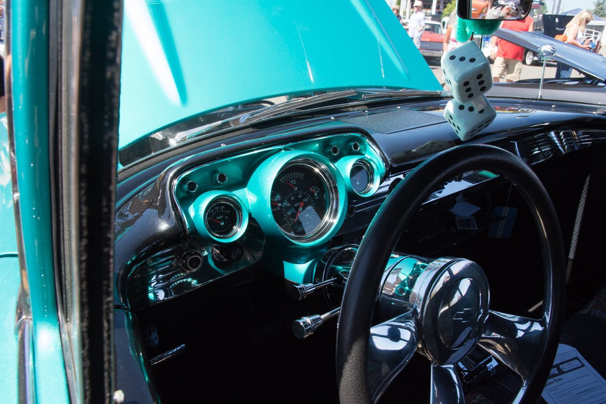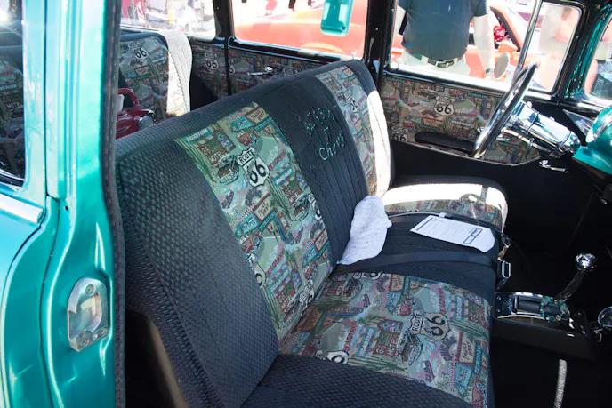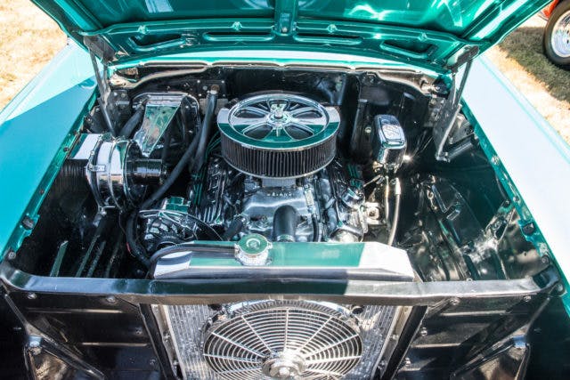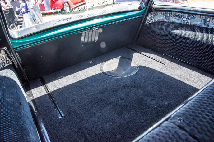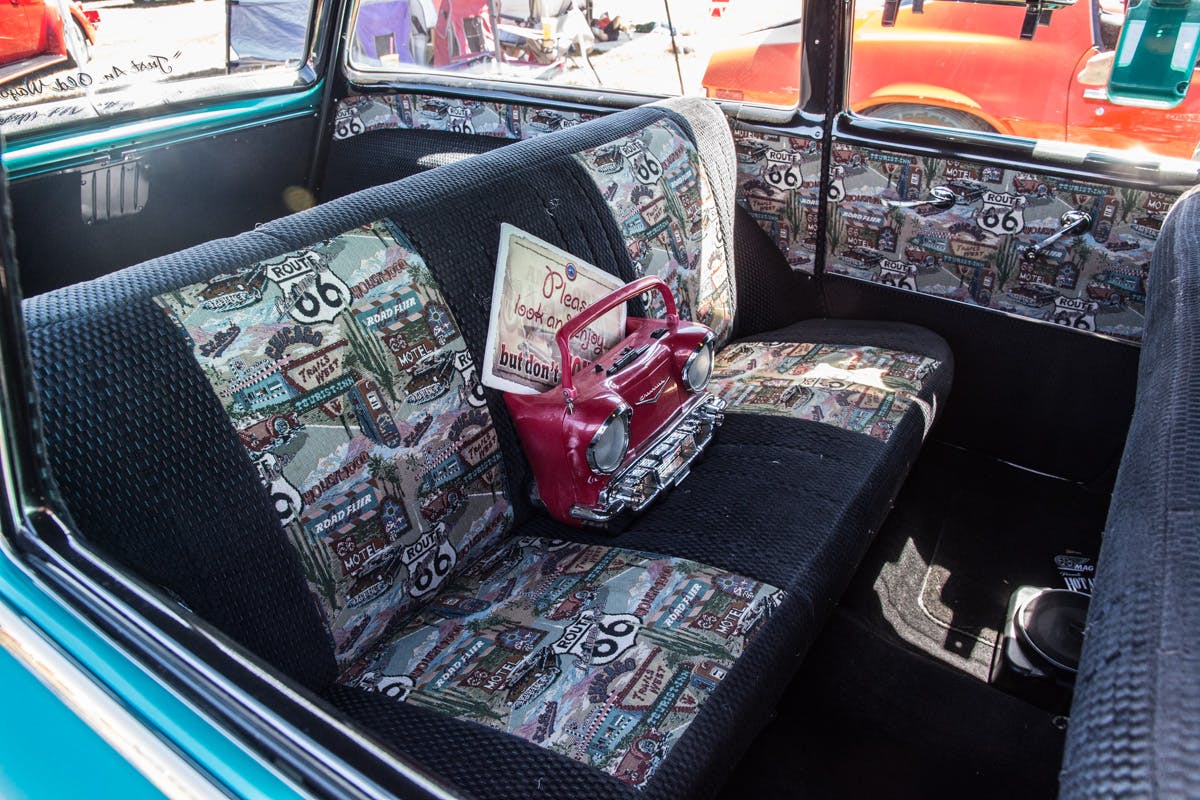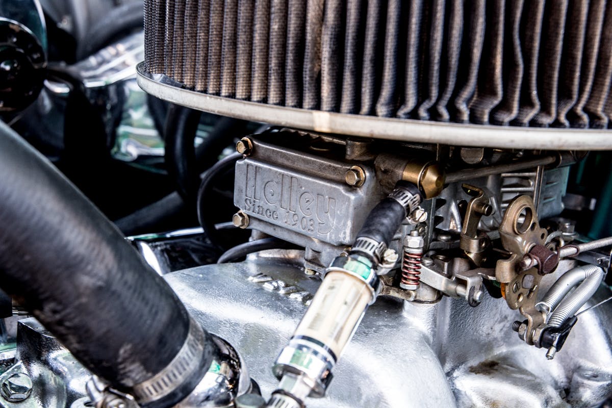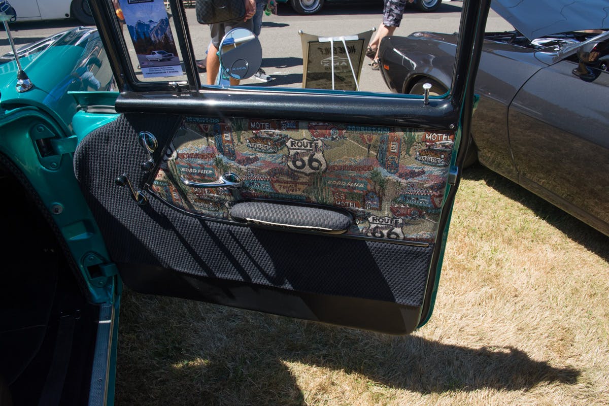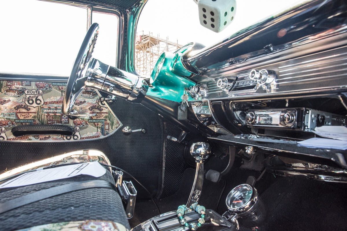 The interior has been upgraded with custom, route-66 inserts selected by Becky, Classic Instruments gauges, and an ididit tilt steering column. It’s a great looking car with a lot of retro touches that made it worth a second look.