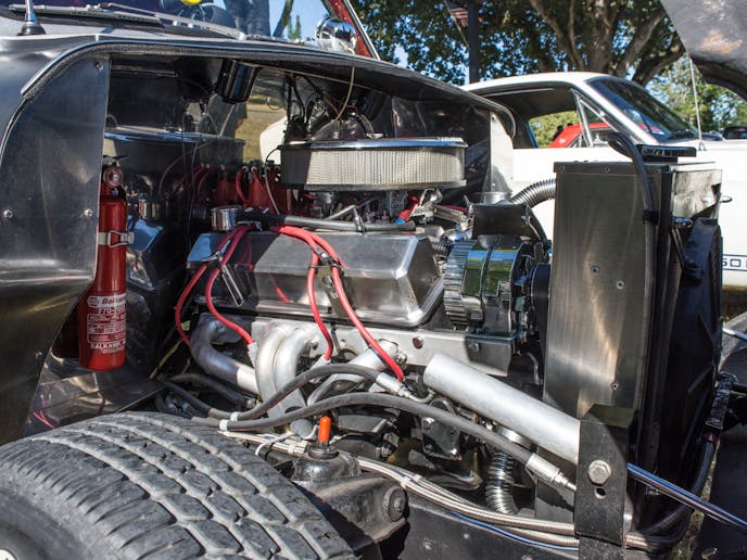 The fiberglass hood was made by welding the fenders to the hood and creating a mold. Now the entire front section is lifted hydraulically and powered by a set of pistons from a 1965 Nash Rambler convertible top.