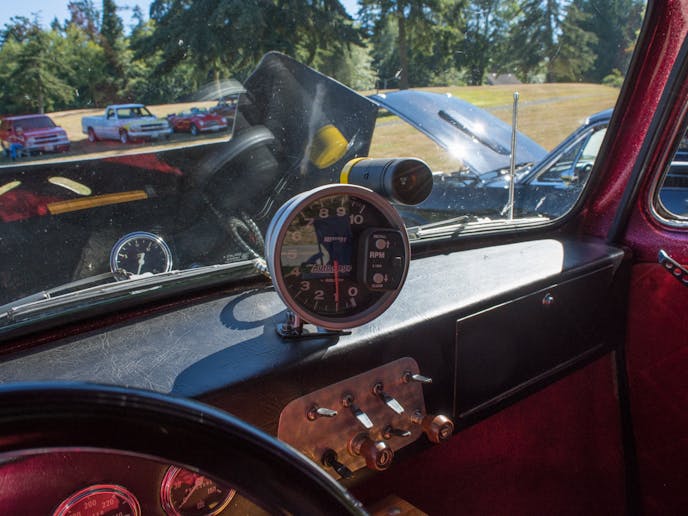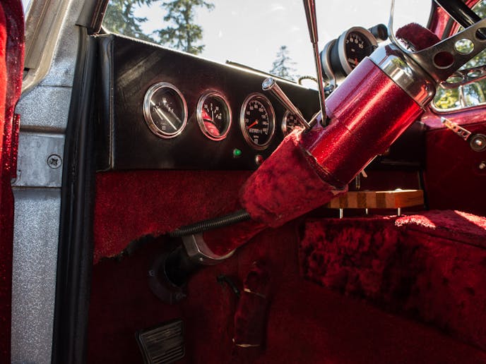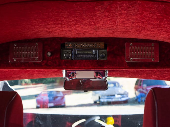 The front end itself is from a 1960 Corvair, but Miles added the disc brakes. The car also features a tilt-telescopic steering column, and a full complement of Stewart Warner gauges. You can also see that the stereo was strategically placed overhead rather than in the dash. This is one cool hot rod.