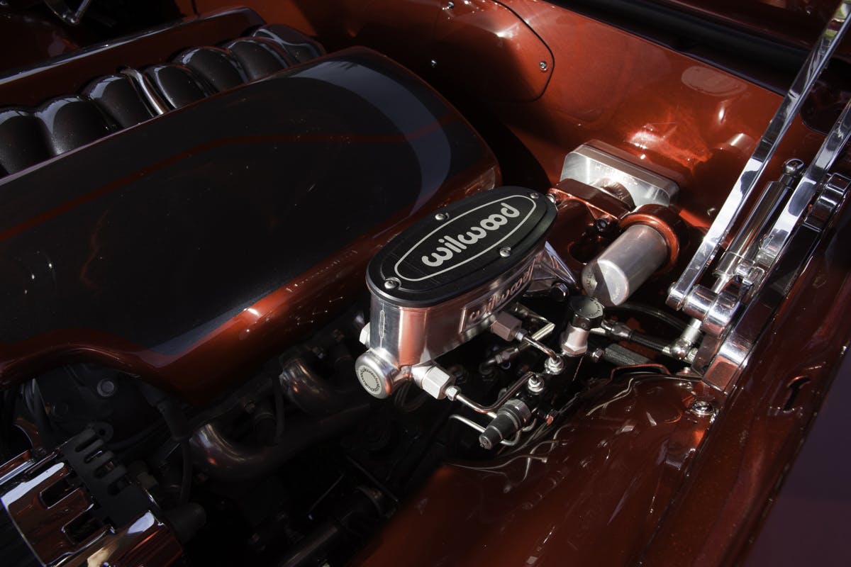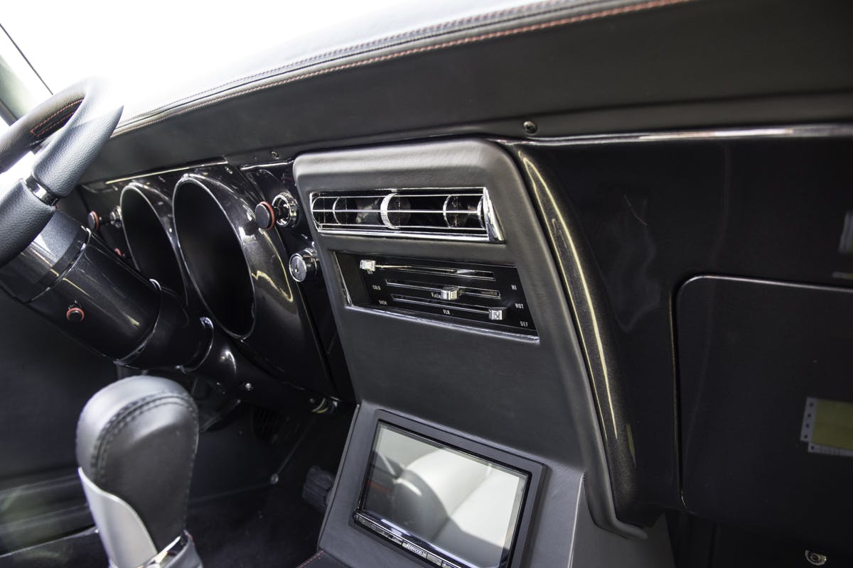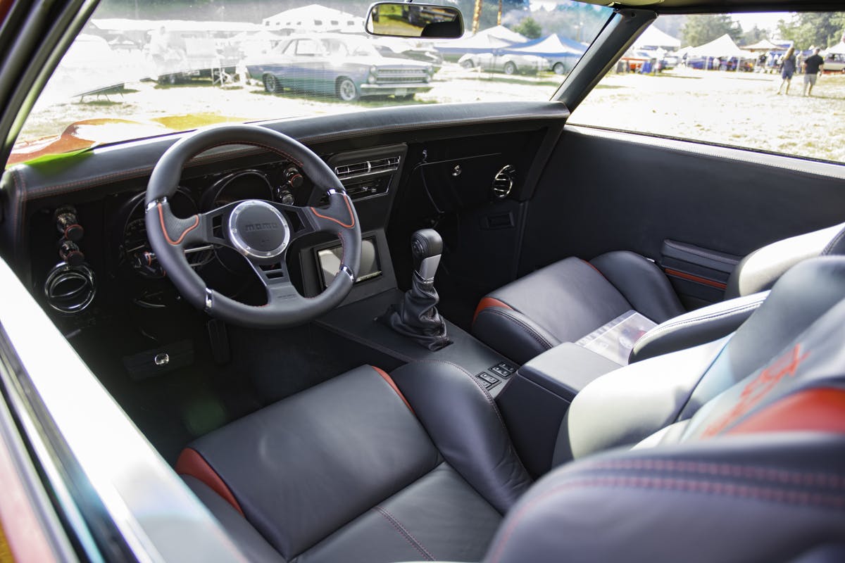 The interior was done by AMA Interior Solutions of Kelso, Washington and features recovered seats out of a 2006 Pontiac GTO, custom door panels, and a custom console. Everything inside is wrapped in European aviation leather. It also features an Momo Italian racing wheel, ididit steering colum, and Dakota Digital dash. The interior also features a Vintage Air A/C system for climate control and comfort.
