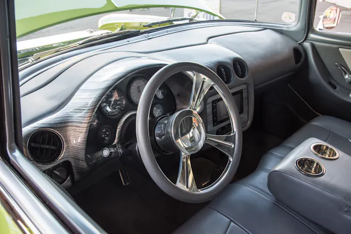 Nick has also updated the interior with seats out of a ‘90s Chevy pickup, a custom steering wheel, and a Hurst shifter. He didn’t go crazy-custom on the interior, but rather put together a modest look that works well with the aesthetics of the rest of the pickup. It’s great because it’s a comfortable, good looking cruiser, but in style and practice it still retains some of the utilitarian heritage that it was built with—and we love that.