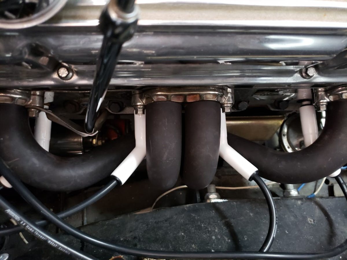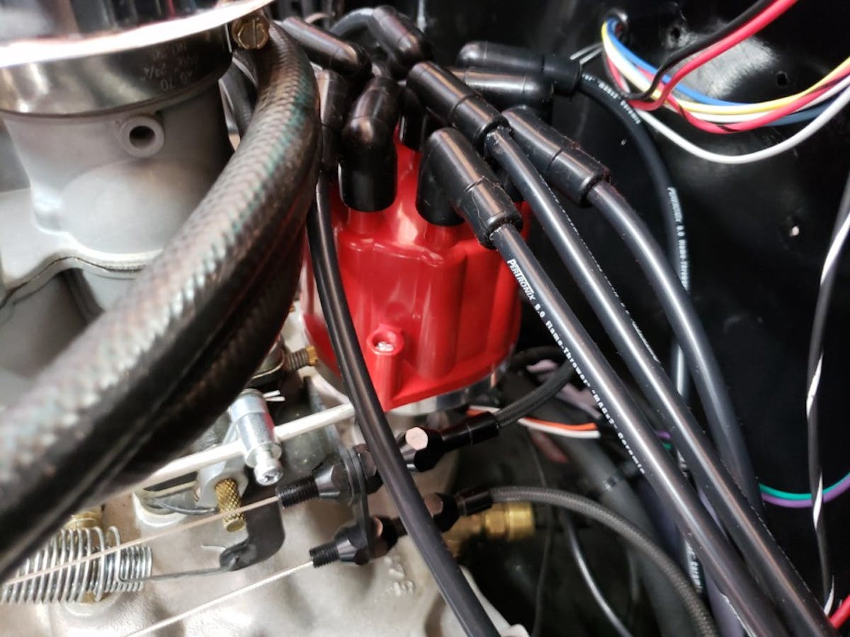 Install your distributor cap taking note of the direction of the rotor and vacuum canister. We replaced our spark plug wires with Petronix plug wires and ceramic boots. The wires have a low 500 ohms per foot of resistance and the ceramic boots can withstand up to 2000 degrees of temperature.