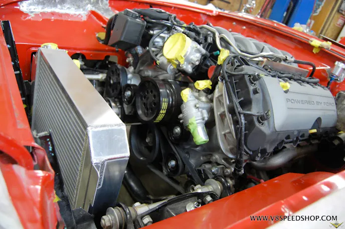 Up front, V8 Speed & Restoration added a tubular control arm to fit around the wide Coyote motor. The Flaming River steering kit added plenty of confidence and clarity, but at the cost of a reluctance to re-center. Even with gobs of castor thrown at it, the steering wouldn’t return to center willingly. However, the car tracked straight wonderfully, and wouldn’t cause the owner any distress while barreling down long country lanes.