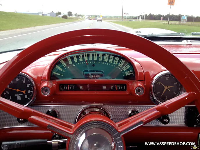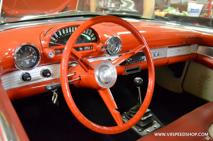 Turning their attentions to the interior, they contacted Auto Meter and designed a tachometer that suited the ’50s aesthetic with the Auto Meter Custom Shop Online Program. This allows the user to choose gauge styles, bezels, glass shape, background color, pointer style, and the font/ticking and their colors. With a piece that looked near-factory, they fitted this within the original clock location.