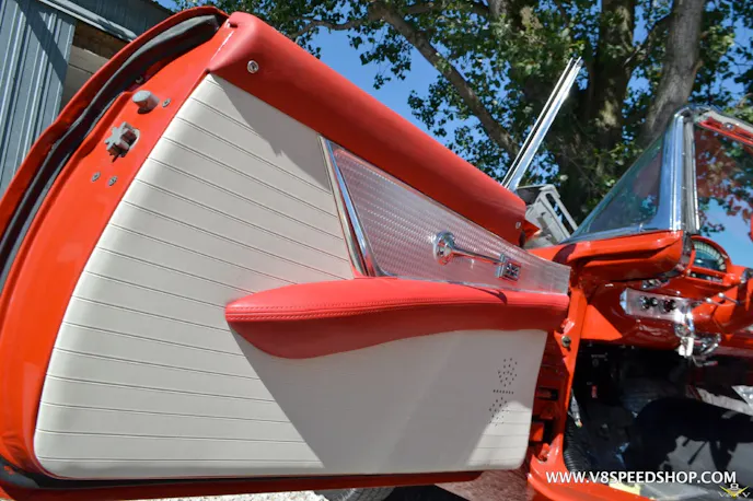 New door panels, door sills, carpeting, gauge faces, dash trim, and other restoration parts were purchased from Larry’s Thunderbird and Mustang, and the door panels were perforated for the speakers hidden subtly behind.