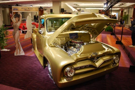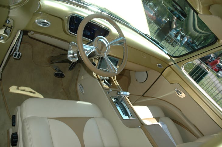 “Golden Gertie” features a 302 stroked up to a 347 and pushes out close to 500 hp. The shifters were drafted out of a 2007 Mustang and the seats came from a 2010 F150.