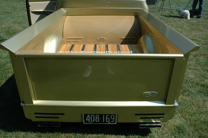 The truck’s vibrant gold is dubbed “Michele’s Gold” after Bloom’s wife who has a prime role in each of his builds, “My wife Michele always takes on color coordinating and her whole thing is she has to pick the leather and the carpet first. English leather from England and the carpet is wolf wool.” The color was developed at Deez Ridez and Rodz.