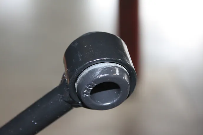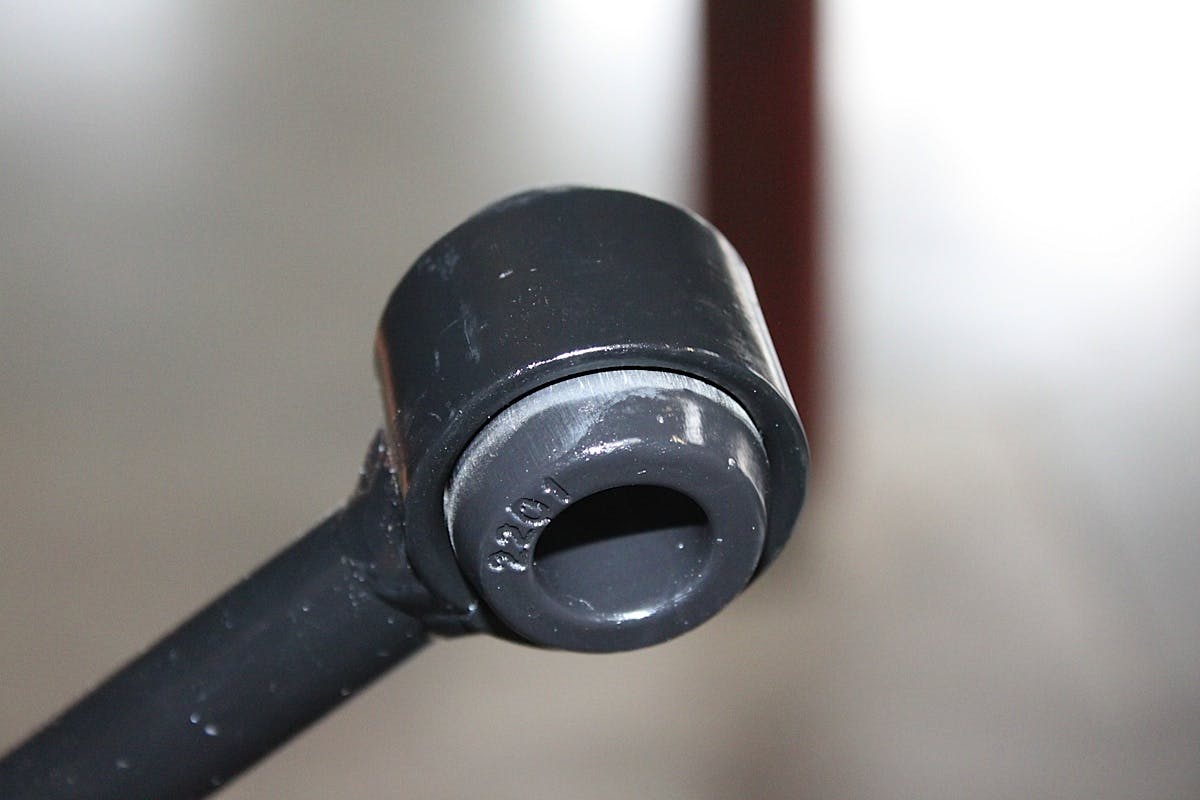 Prior to installing the rear end-links, we lubed the outside of the bushings. The grease does double duty, as not only does it keep the bushings from squeaking, but it helps get them into place for installation as you can see from the picture above.