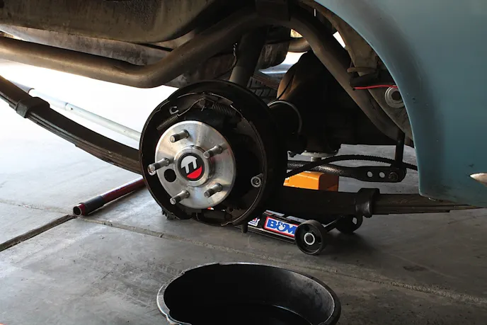 We replaced the rear studs on our ’65 Plymouth, but the front studs can be replaced in a similar manner. After putting the car on jack stands and removing the wheels, the task of replacing the studs is much easier than you think. You don’t need to press them out, you simply use a hammer or a five-pound sledge like we did to pound them out. After pounding out the five studs, we rotated the axle to allow room behind the flange to get them completely out.