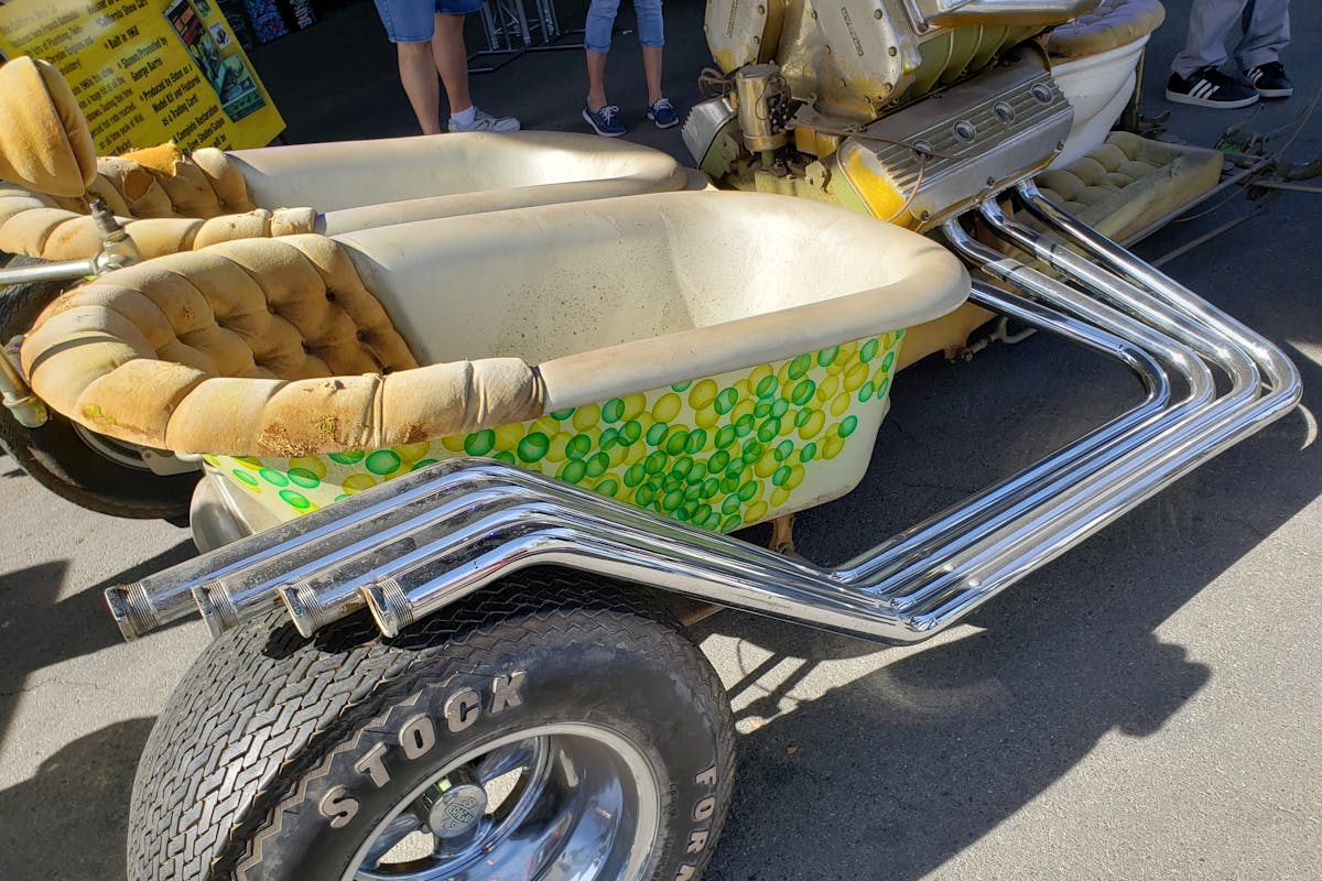 The entire Boeckmann family loads themselves into the numerous tubs with Beau firmly affixed on the throne as they fire up the ‘Tub and drive it into the show area. We’re not sure what fuel was put into the gas tank located deep under the toilet seat, but since this car apparently has no cooling system, and those now-gold pipes show a definitely discoloration, we’d say this car is destined for only short runs- across show floors- indoors- VERY infrequently. But, it does run, a fact solidified by watching the Discovery episode video titled “Lots Of Plumbing”.