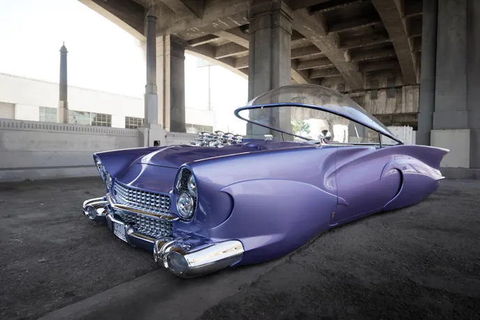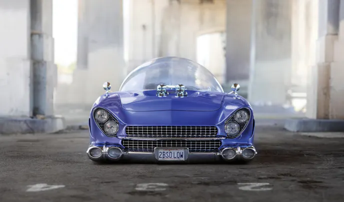 Fioto’s love of automobiles would inspire a long and storied hot rodding career that culminated in his Orange County shop, Chopit Kustoms. The Beatnik Bubbletop began life as just another 1955 Ford, though there isn’t much of the original car left. Fioto merged elements from Cadillac, Chrysler, and Lincoln onto the Beatnik Bubbletop, including a ‘59 Cadillac front bumper the finned taillights from a 1960 Chrysler, and the chassis of an ‘88 Lincoln Town Car. Powering all of this is a Chevy 350 V8. Seriously.