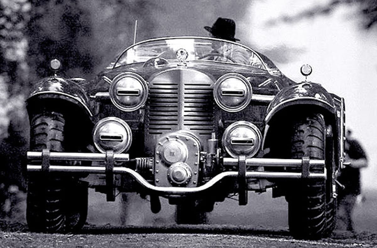 The fact your mind’s eye instantly jumps to heavy-hauler status when viewing the double set of rear rollers is understandable. In fact, the car which measures 25 feet in length, is based on a truck chassis. While those eight exhaust ports on each side of that long, sumptuous, center-hinged hood hint at a powerful 16-cylinder engine, reality will find a beefed-up Ford V8 situated below. Fantasy was the purpose of this particular design, but the project needed to materialize into the real world, at least enough to help promulgate the financial purpose of the fictitious endeavor.