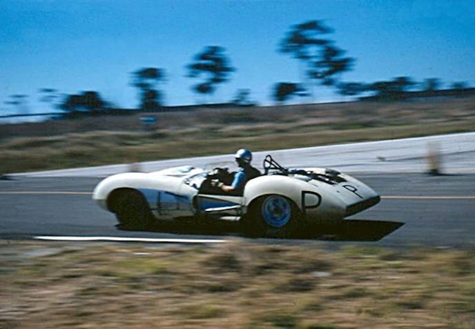 Along with the other cars General Motors brought a Corvette SS which was nicknamed “P” for “Practice”. This was a stripped down car that basically had plain white paint on the fiberglass body. After John Fitch ran his practice laps, Dunton gave the wheel to two famed GP racers, Juan Fangio from Argentina and Stirling Moss of England. Both men from Team Maserati were allowed to run courtesy laps in the practice car.