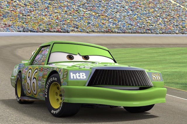 The #86 Chick Hicks’ car primary sponsor is the Hostile Takeover Bank (htB) which explains where Chick’s win-at-all-cost mentality comes from. In the final race of the season, Chick attempts to take Lightning McQueen out of the race, only to have Lightning outrace the perennial runner-up. Chick intentionally crashes The King on the last lap of the race, causing Lightning to stop and check on the legend. When Lightning stops, Chick crosses the finish line and wins the piston cup in dastardly fashion.