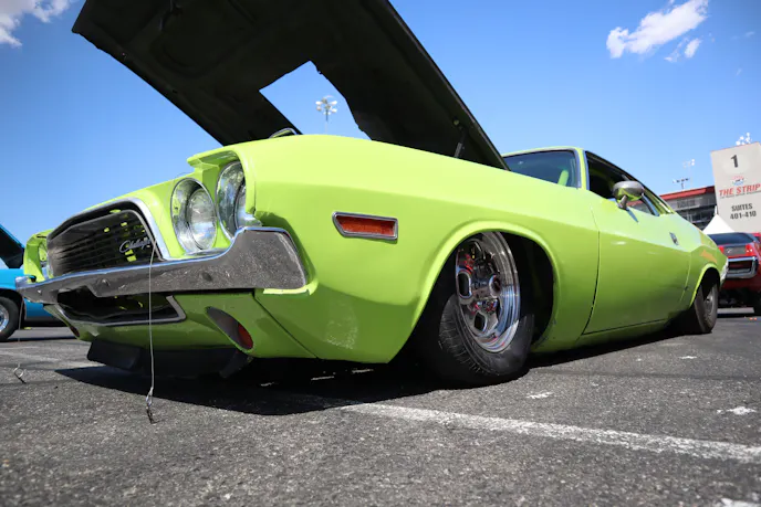 That he did! The radical modifications and devil-may-care attitude the Challenger has is exactly what stopped us in our tracks. For starters it’s sitting on the floor in a sea of jacked up muscle cars. That is because of the air bags and custom chassis that was built for it. The frame rides 3-inches higher than factory and allows the Challenger to sit on its body.