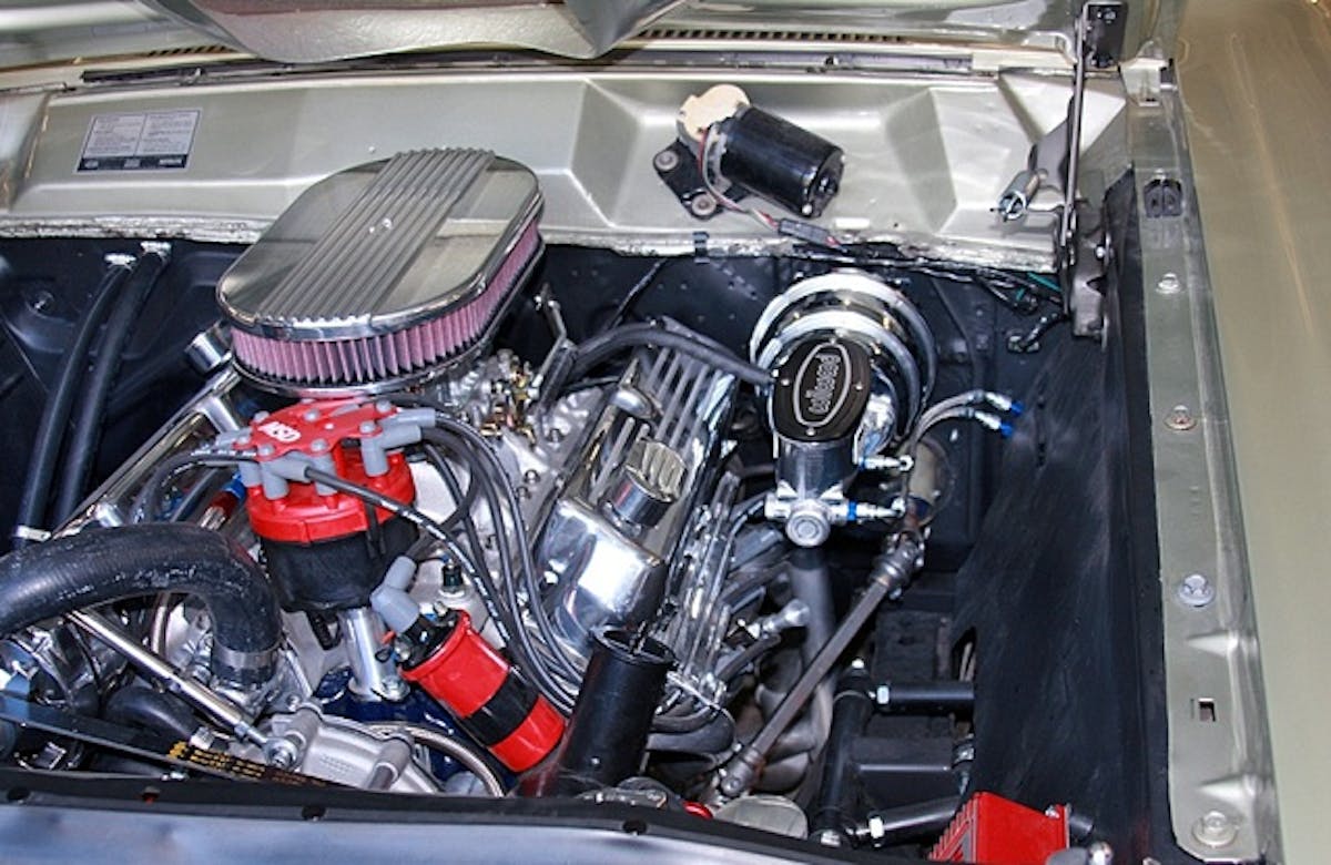 The work began with a 347 stroker V8 engine equipped with an Edelbrock Air Gap intake, Howards roller camshaft, Patriot Performance aluminum heads, and a Holley 6650 double pumper carburetor. All together this combo made over 450 horsepower and 418 ft-lbs of torque on the engine dyno. Those are some good numbers, but it was only the beginning of the modifications.