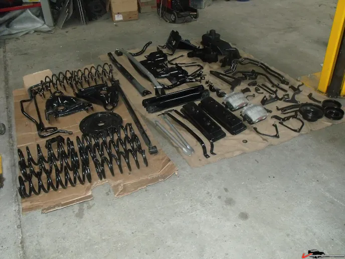 Sounds like this builder has a common sense build in mind, which means that it will get done in a reasonable time frame. Some of the detail work, however, is beyond interesting. With the engine and transmission out the the car, virtually every bracket and suspension component that can be removed was sent to the powdercoater for refinishing, in black, of course.