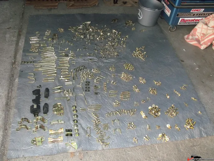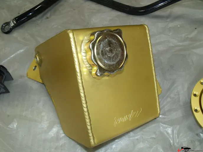 OK, that may not seem unusual on the surface. Next, virtually every fastener that came out was sent out for refinishing and replating in zinc dichromate which, of course, comes back with a gold finish. Similarly for a number of under hood components, such as his custom overflow tank, it was sent out for a matte gold finishing.