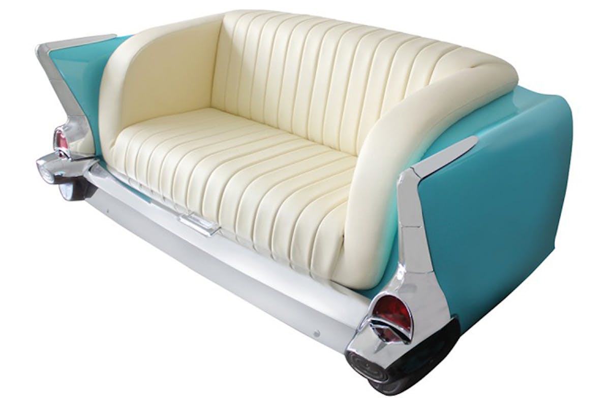 United Pacific Industries, long dedicated to serve the classic and antique industries with exceptional value and performance, is proud to introduce a custom made leather sofa using actual 1957 Chevy Restoration body panels. In addition to using newly stamped restoration parts, the sofa comes with high quality United Pacific chrome bumper and trim. Since the frame of the sofa is accurately reproduced 1957 Chevy body panel, and the bumper and trim are authentic United Pacific chrome parts, the tail light assembly can be wired to illuminate just like the real thing. Wiring and lighting equipment sold separately.