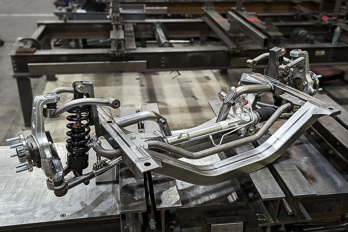 The new K-member will work with the modern Hemi engine platform by keeping the mill in the stock engine location. The K-member features a three-position adjustable hollow sway bar with adjustable end links. This was done to eliminate preload, while accommodating high static negative camber angles for low treadwear tires that provide more grip.