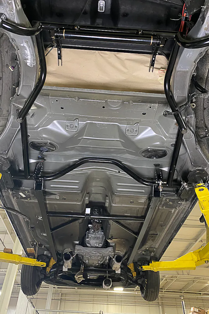 “So, we came up with a complete package. It’s a fabricated nine-inch rear that allows you to run a nine-inch, nine-and-a-half, or ten-inch ring and pinion that uses our custom alloy axles. The subframe assembly has an anti-roll and torque arm to help plant the power and the subframe connector runs up to the front of the car to help transfer the load. This allows the chassis itself to get a really good bite when you launch the car and you don’t have to worry about anything breaking.