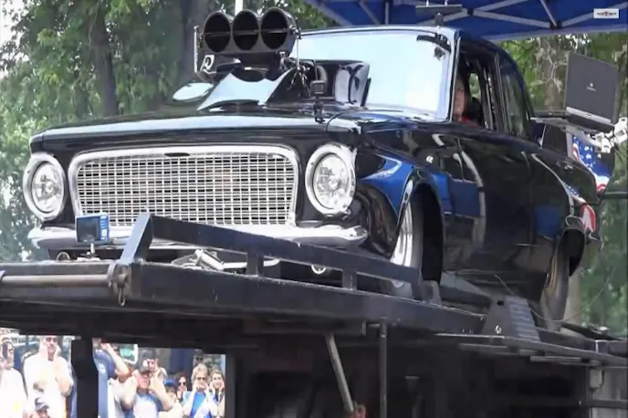 The Valiant sits on a 4-link suspension while a moly roll cage protects the driver. The car beis driven on the street legally using DOT approved drag radials. While cruising the roads of Minnesota, its operated at 5% overdriven using 1500 horses instead all of 2500. Not only is this Valiant the coolest grocery-getter on the street, when equipped with street tires and bigger gears this beast can compete with the best in Pro Mod.