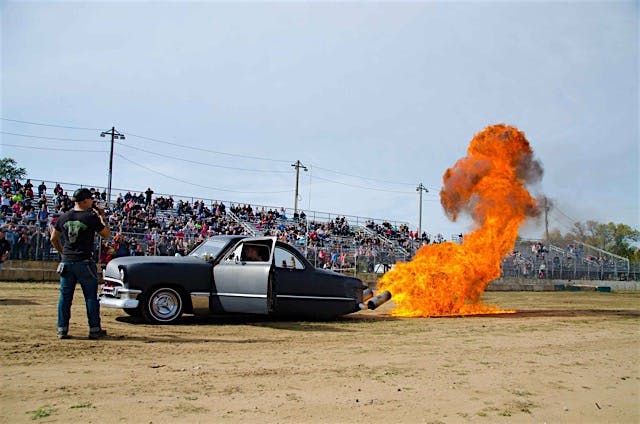 Spotted at the 2015 Frankensteiners Ball in Anoka, Minnesota, we saw one custom that’s hot like fire. We’re talking about this 1950 Ford Business Coupe that is literally an automotive flamethrower, which was a spotlight for Tinman 2 Kustoms.