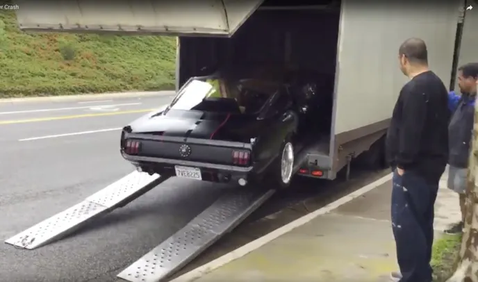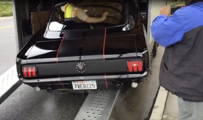 As unlikely as it sounds, this video is proof that even the pros make mistakes. We see the driver get into the classic Stang, put it in gear, stick his head out the driver’s window to line up the tires to the ramp. Halfway up the ramp things go wildly wrong. The rear tires start to slide to the right on the two-piece sliding ramps. The driver continues to speed up the ramp hoping to make it on the trailer before the rear-end slides off the ramps.