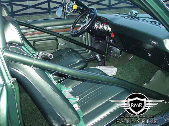 In the rear, stock-style Calvert Racing split mono-leaf springs (stock ride height) are mounted with Global West shackles. Calvert Racing CalTrac bars and Rancho 9-way single adjustable gas shocks help keep the rear tires planted. To build a more track ready ride the Chevrolet 12-bolt rear from a 1968 Chevelle was narrowed 3/4 of an inch per side and modified to use with leaf springs, 3.55 gear ratio, Strange spool, 33 spline axles and c-clip eliminators.