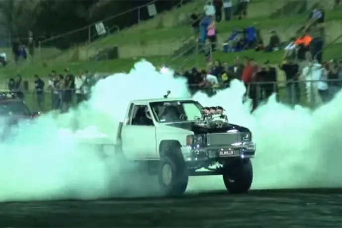 While the specific event which this burnout comes from isn’t specified in the video, it’s hard to imagine that “BLWNLUX” didn’t take home a trophy that night. Take a gander at the clip to see one gnarly Hilux decimate a pair of mud tires with extreme prejudice, and dig on those glowing exhaust headers too.