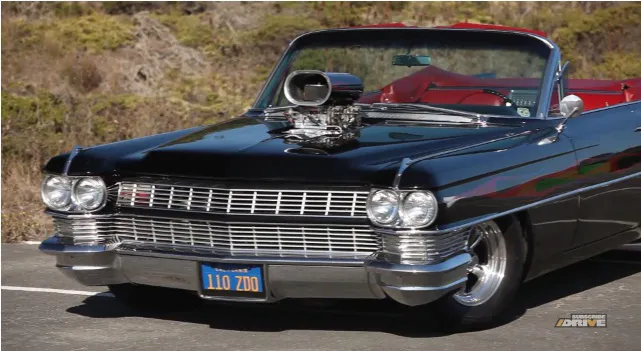 Owned by Ron Dean, this vintage Cadi is anything but typical. Clad in a black paint scheme with custom flames and an Oxblood interior, this Cadillac has plenty to offer. But while the interior and exterior color schemes are definitely noticeable, there’s one defining component that makes this car the hippest vintage Cadillac around. Of course, we’re talking about the massive 671 blower sticking out of the hood.