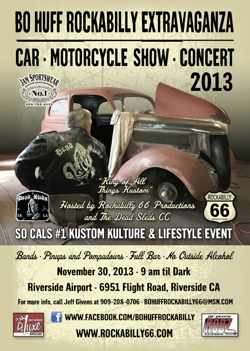 Bo Huff “King of all Things Kustom” will of course be in attendance along with members of the Dead Sleds CC. For more information on the event you can check out the website here or contact Jeff Givens at (909) 208-0706. For day to day updates check out the Bo Huff Rockabilly Extravaganza Facebook.