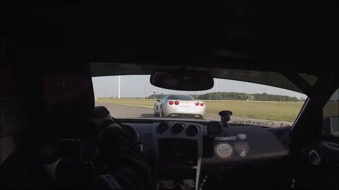 A square setup with 275-section front tires, as well as a decent differential, help the car turn into the corner and exit neatly, and in some sections, he’s able to match the performance of a tuned S2000—a car far more agile, fundamentally speaking. However, the power advantage over the Honda helped Gardner by (come the course’s long front straight). So, what happens when he’s caught behind a stock Corvette Z06, which has the same advantage and disadvantage over the Nissan which the Nissan held over the Honda?