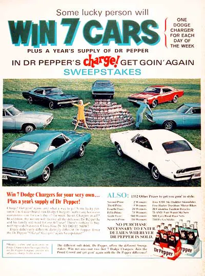 Here’s one: This Dr Pepper “Charger, get goin’ again!” promotion from 1968 is the perfect example. The prize? A Dodge Charger for each day of the week.