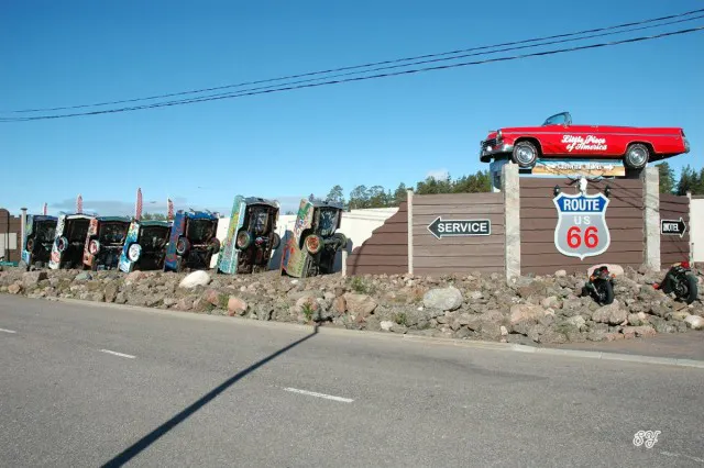 Adjacent to the directional sign you’ll find their own version of Cadillac Ranch, another famed attraction along Route 66. Cadillac Ranch is an artsy project that started as a piece of public art to confuse the locals, and some transplanted art-hippies from San Francisco planted a tribute to the Cadillac tail fin in the dirt just west of Amarillo, Texas.