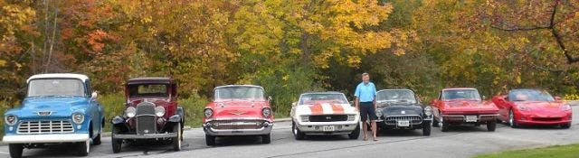 Phil owns seven extremely nice classic Chevys, eight if you include the grand kids’ #3 Compuware Corvette, and amazingly he fits them all in a 3-car garage. Sounds unbelievable right? Well, the proof is in the video above where Phil, his father-in-law and a couple of his friends show just how his ‘06 Corvette convertible, ’63 Sting Ray Corvette, ’57 Corvette roadster, ’69 Indianapolis 500 Pace Car Camaro, ’57 Bel Air convertible, ’31 AE Independence Sport Coupe and ’55 3100 pickup fit in the tight quarters. They even demonstrate how each car is moved in and out of the garage safely.
