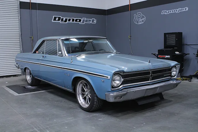 The donor car is a 1965 Plymouth Belvedere II with an era-correct 318 Polysphere engine. But that’s where “stock” disappears and “custom” takes over, because the car has been modified. The 318 has been massaged a little, and produces close to 100 hp more at the crank than the original engine did, and on top of the intake is an EFI throttlebody conversion in place of the carburetor that once resided there.