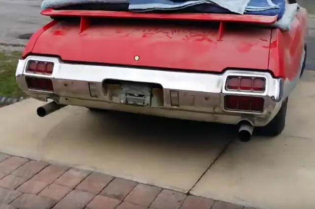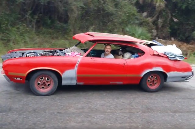 The Oldsmobile in the video above, which appears to be about a 1972 442, has all the aforementioned accessories: the hood is on the roof of the car with what appears to be sheets of plywood and cardboard underneath, and sticking through the back window opening is an assortment of fender protectors and moving blankets. The back seat is packed with what us gearheads like to call “stuff”.