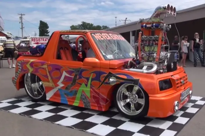 Geo Tracker Never EnoughSome people from overseas have labeled Americans as excessive, and after seeing this ride that YouTuber NotBob discovered at the 2015 Slammin & Jammin show in Lebanon, Tennessee, they might be right. By either magic or insanity the owner managed to stuff a blown Chevy 350 into a Geo Tracker.