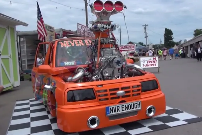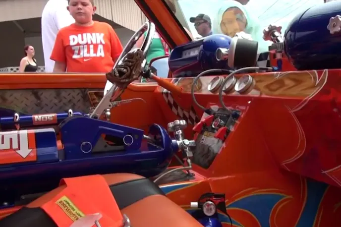 With its massive blower and stack, orange ’80s pro street paint job, and slammed stance, it looks like something out of a cartoon or a fantasy car from a ’90s PS1 racing game.