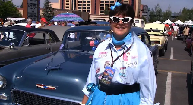 By far the event’s most colorful car owner, ’55 210 sedan owner, “Doll” Edwards not only drives a cool shoebox but seriously looks the part doing it, “I’ve been doing Hot August Nights for like 26 years. I have outfits for every day…my sister and my boyfriends had ’55 Chevys so it’s great fun, a lot of nostalgia.”