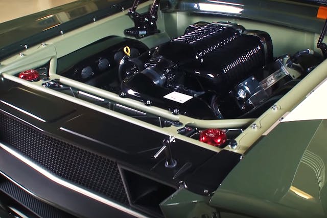But the real meat of this Mustang isn’t its carbon fiber body, which weighs just 180 pounds compared to 700 or 800 for the original steel body, but the 950 horsepower, 427 cubic-inch LS7 engine that sits under the flyweight hood. The gorgeous motor has a Whipple supercharger on top and ever manner of performance modification to put out that kind of tire-shredding power, and only a Ford 9-inch rear end can properly handle it.