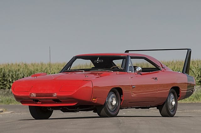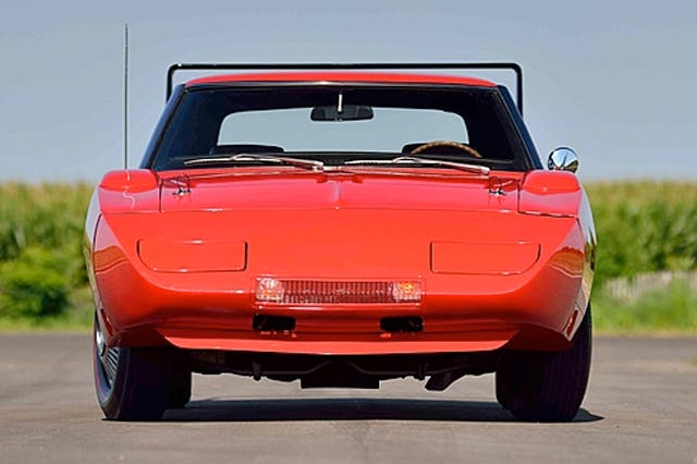 Expected to reach upwards of $700,000+, this Bright Red (Code R4) Daytona wears a black stripe across the quarters and a black interior. Under the hood, the Hemi is pulling in air from a pair of four barrel carburetors and sending the power back to a Dana 60 SureGrip rearend via the A33 Track Pak option.