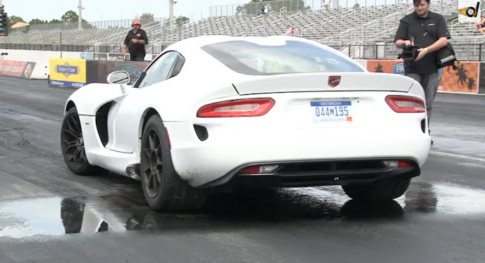 As you’ll quickly notice, the driver chose to run with a set of drag radials making the trip to the strip more than merely an exercise in wheelspin. The video reports that the first run was done with the launch control on and revved to 5,500 RPM. After the rear tires erupt into a glorious water-box burnout, the Viper appears to nearly stall right off the line, but presents no spin what so ever. The result of 1.75 short time, 11.16 at 127 MPH. The next run was performed with the launch control off, and there’s again slight bog off the line as the car leaves just off-idle. However, the 8.4L V10 gets all 640 ponies wound up and gets down the track in a hurry.