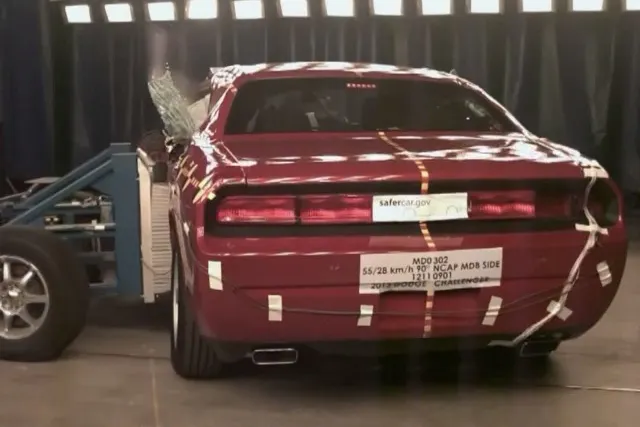 After watching our featured video one really has to think that NHTSA doesn’t skimp when it comes to vehicle safety, as the ’13 Challenger in question suffers a massive degree of side impact damage during testing, causing its side-impact air bags to fully deploy.
