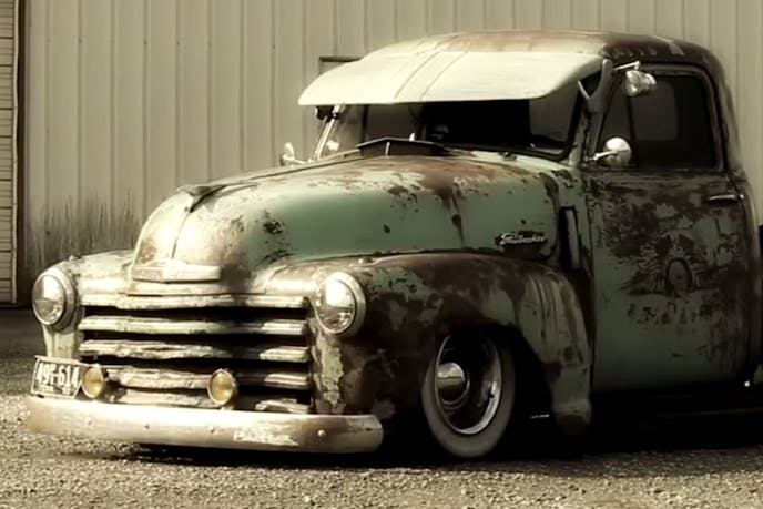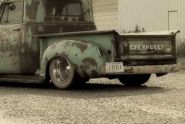 Whether it is real or not, some cars just have the IT factor when they have a patina finish. The video above shows an impressive example of how the patina finish can work oh so well with a modified vehicle. Built by Knuckle Head Garage, this 1948 Chevy pickup was built with an incredible amount of detail. Lightly cleaned emblems and trim pop off the light green paint and rough rust. The very 40s-ish vibe just oozes off the truck. The interior is on the level with a license plate floor board as well as a stained and torn seat cover.