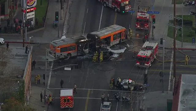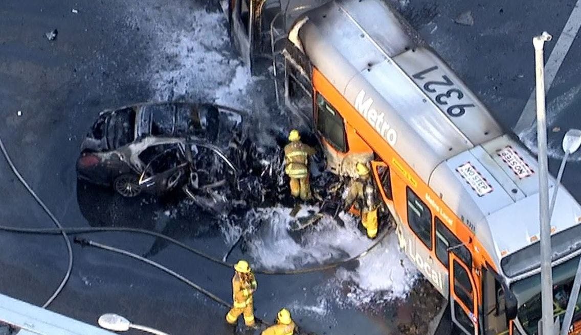 Luckily the bus was empty except for the driver, because – as we can see in the photos – it was cleaved almost completely in half. A fire instantly sprang up and consumed the vehicles, and bystanders and police rushed in to help pull people from the cars.