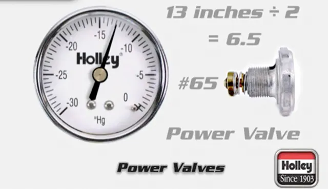 pv01Whatever your reading is, there are a couple of different methods for determining the power valve rating, as described in the video. One method is using half of that vacuum reading. For example, 13-inches of vacuum divided by two (13/2) equals 6.5, or 65. If there isn’t a power valve for your reading, go to the next size down. Another method is to take that reading and subtract two (13-2) and going to the next lower power valve.